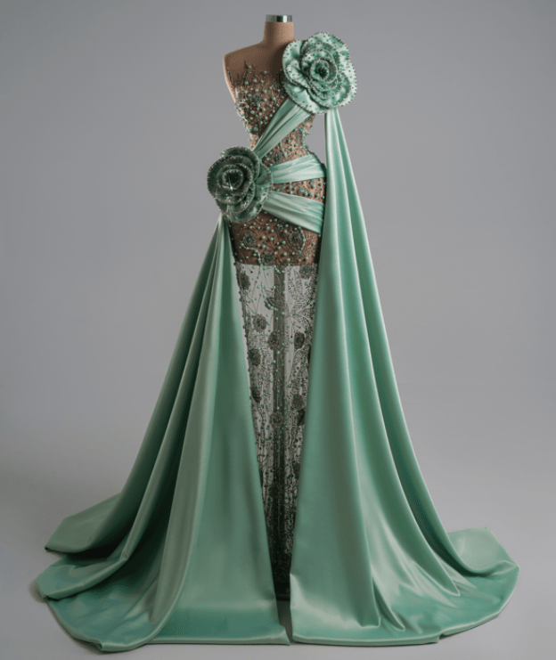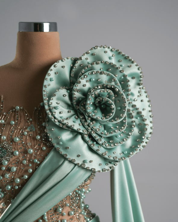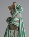 Dive into elegance with this mesmerizing aqua long dress, evoking the serene depths of the ocean. The shimmering silver stones embellish the chest cut-out, reminiscent of sunlight dancing on tranquil waters.