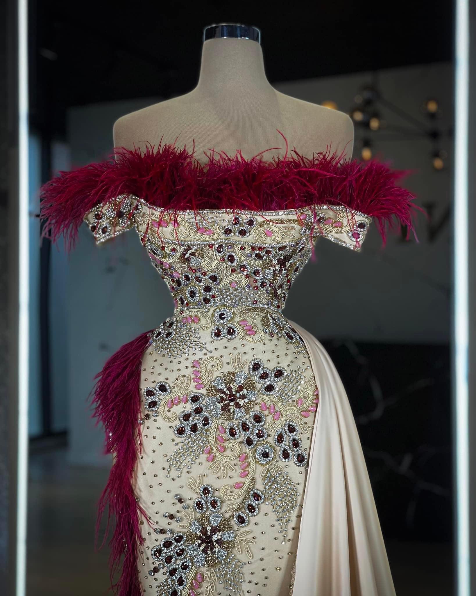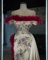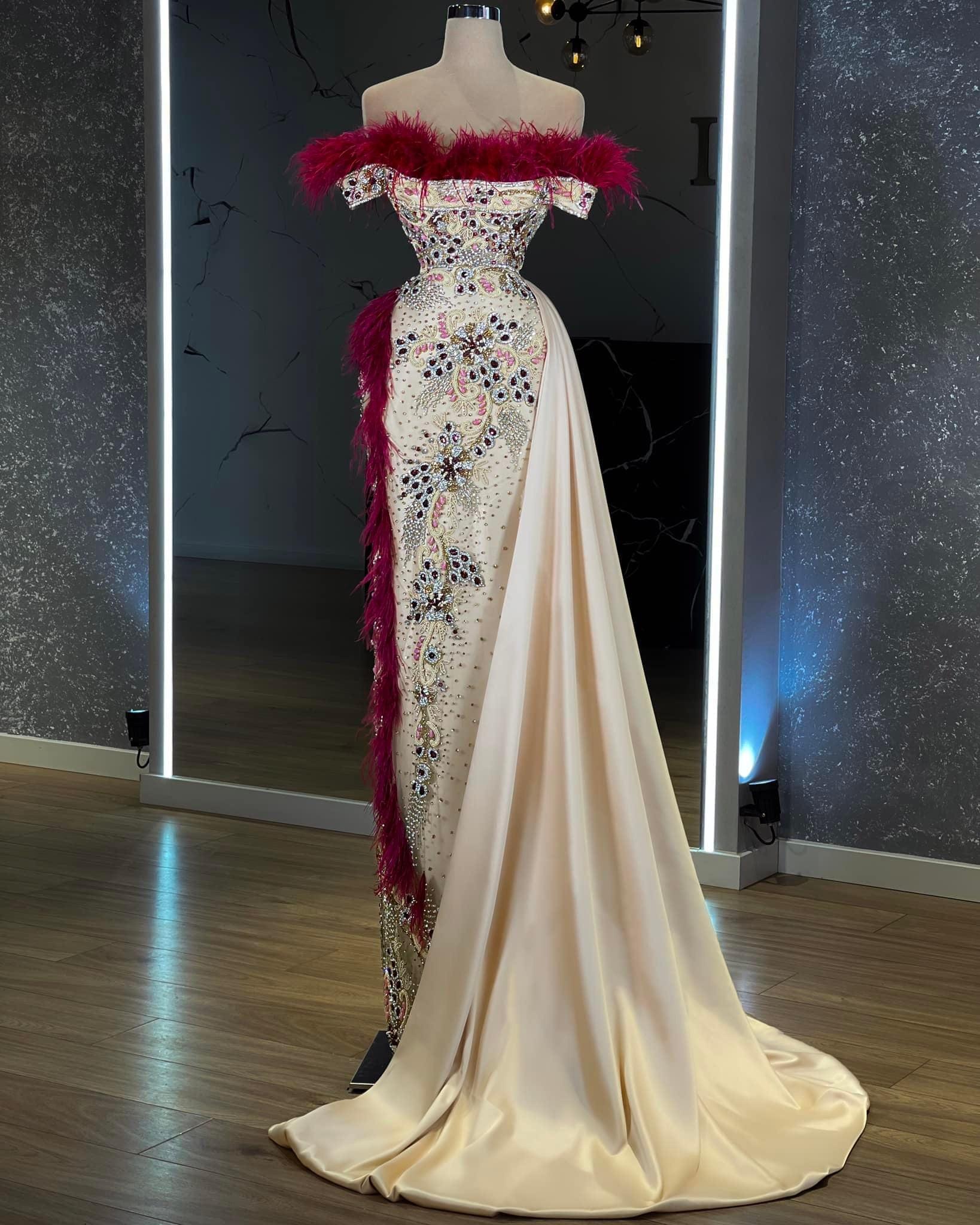 This stunning long dress is a true showstopper. The off-shoulder design is both elegant and feminine, while the champagne color adds a touch of glamour. The dress features a side tail that adds a playful, flirty element to the design. The dress is embellished with sparkling stones that catch the light beautifully and adds a touch of sparkle. The red feathers provide a unique and eye-catching detail to the dress, making it perfect for any special occasion. The dress is made of high-quality fabrics and is comfortable to wear. It will definitely make you stand out in any crowd.