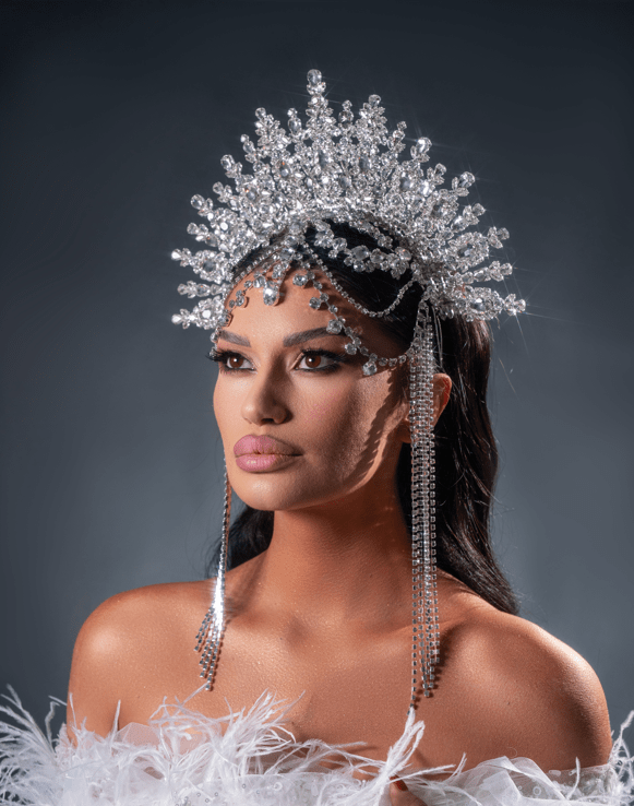 Designed to catch the light from every angle, it enhances the bride’s natural glow, providing a subtle but captivating shimmer. The gentle curvature of the tiara ensures a flattering fit that complements a variety of hairstyles, from romantic waves to sleek updos.