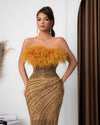 Introducing the ultimate showstopper - a long, sleeveless dress that combines opulence and glamour in the most breathtaking way. This stunning gown features a unique feather embellishment in the bust, adding a touch of whimsy to its elegant design. The true star of the show, however, is the intricate embellishment of precious stones in a gleaming gold hue. From top to bottom, every inch of this dress shimmers and sparkles, catching the light and drawing the eye. The sleeveless design keeps the look modern and fresh, making it perfect for any special occasion. Whether you're the center of attention at a gala, a wedding, or any other grand event, this dress will ensure that you turn heads and make a lasting impression.