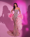 Adding to its dramatic flair, the look is completed with voluminous pink ruffled accents that drape gracefully over the arms, blending soft textures with the gown’s shimmering surface. These bold ruffles introduce movement, dimension, and a touch of old-Hollywood glamour. The matching crystal choker enhances the ensemble with extra brilliance, tying the whole look together.