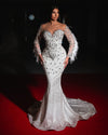 The sweetheart neckline, enhanced by an illusion sheer overlay, exudes sophistication, while the intricate beading cascades gracefully down the bodice and skirt. Delicate feather accents embellish the long, sheer sleeves, adding a touch of ethereal beauty and movement to the design. The combination of the feathers and crystals creates a harmonious blend of modern glamor and timeless elegance.
