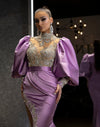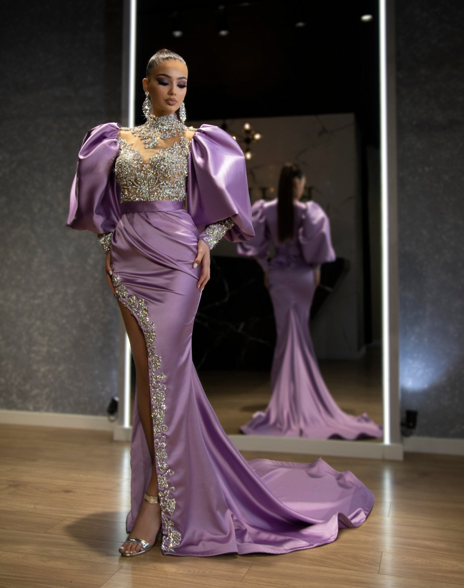 This stunning purple dress is the perfect choice for your next special occasion. The high neck and puff sleeves add a touch of vintage-inspired charm, while the deep slit adds a touch of sultry glamour. The floor-length silhouette is elegant and sophisticated, making this dress perfect for formal events such as black tie parties or prom. The slim fit of the dress flatters your figure, while the sparkling stones and intricate beadwork add a touch of luxury. The rich purple color adds a touch of drama to this already breathtaking dress. Whether you style it with statement jewelry and heels or keep it simple with a sleek updo and minimalist accessories, this dress is sure to turn heads.