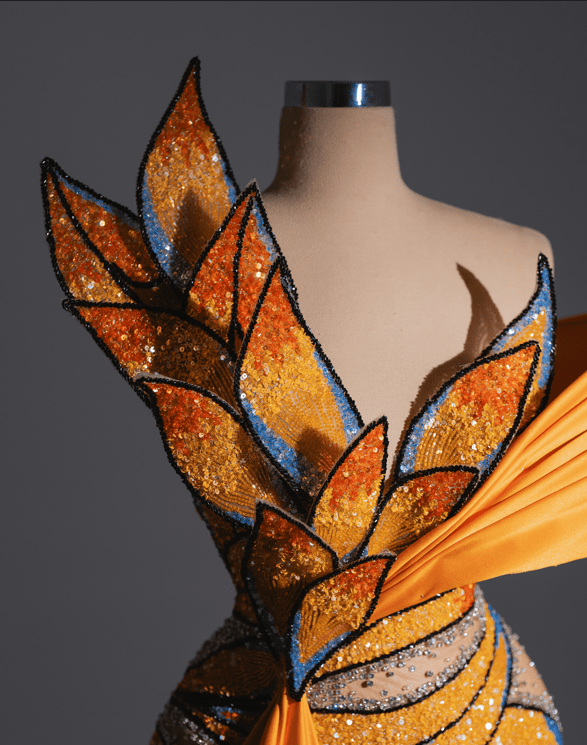 A vision of fire and passion, this striking long dress ignites the room with its radiant orange hue, reminiscent of flickering flames. The luxurious fabric cascades like molten lava, shimmering with every movement.