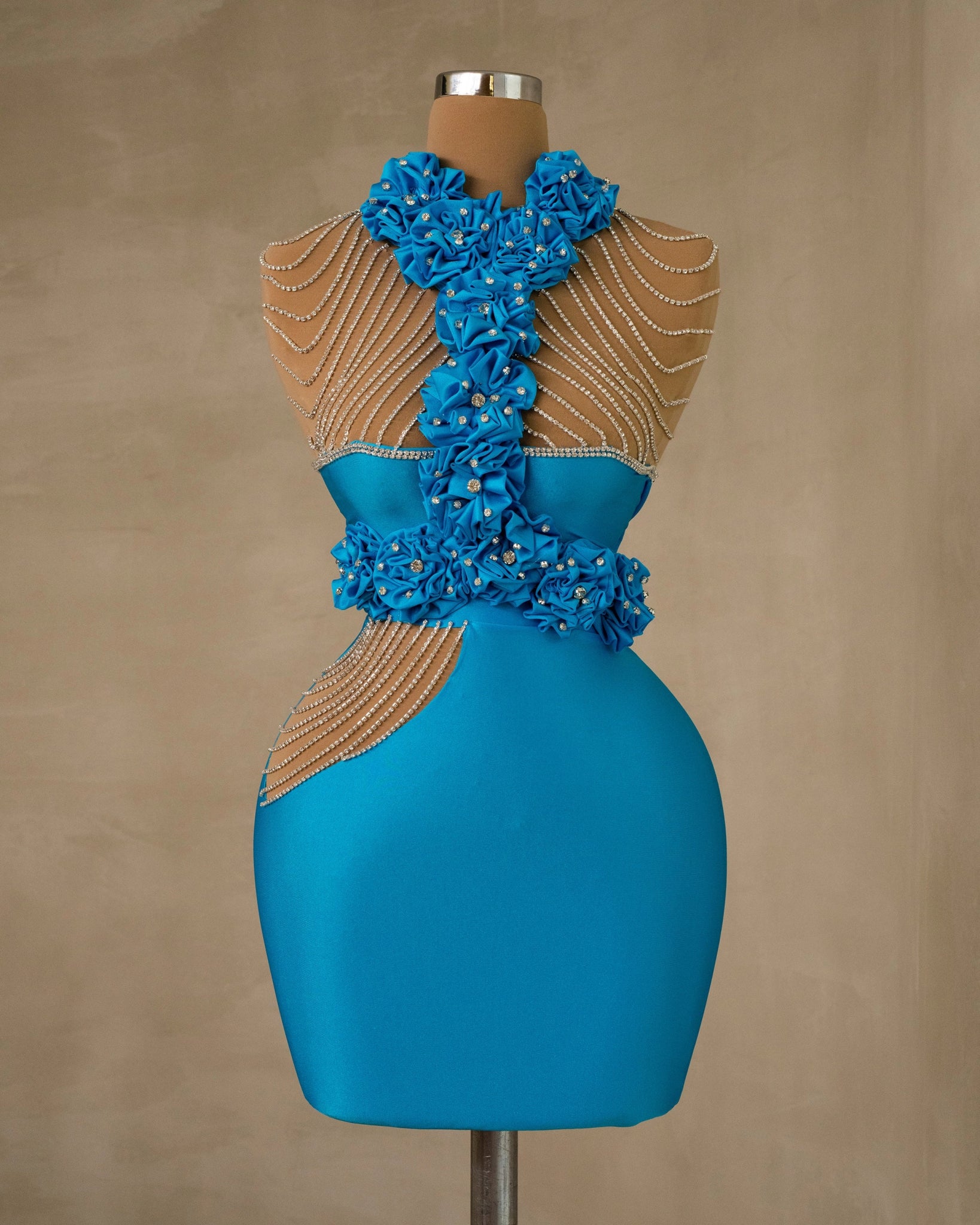 Immerse yourself in the depths of aquatic elegance with our Sleeveless Dress with Silver Embellishments. Crafted in a mesmerizing aqua hue, this dress boasts intricate details and silver embellishments that radiate sophistication and allure.