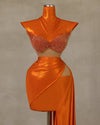 Introducing an Orange High-Neck Dress Embellished with Pearls, crafted from a fabric that glimmers and gleams like sunlight on water, Orange High-Neck Dress Embellished with Pearls is a testament to elegance that catches the eye at every turn.
