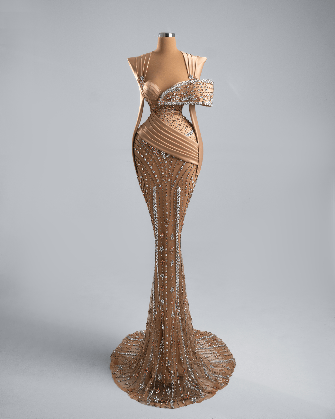 This exquisite nude evening gown embodies modern sophistication and luxurious glamour, designed to accentuate every curve with flawless artistry. The dress features a unique asymmetrical bodice, combining soft, sculpted draping with shimmering crystal embellishments for a captivating interplay of texture and light. The daring cutouts along the sides create a striking, hourglass silhouette, offering both sensuality and refined elegance.