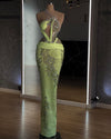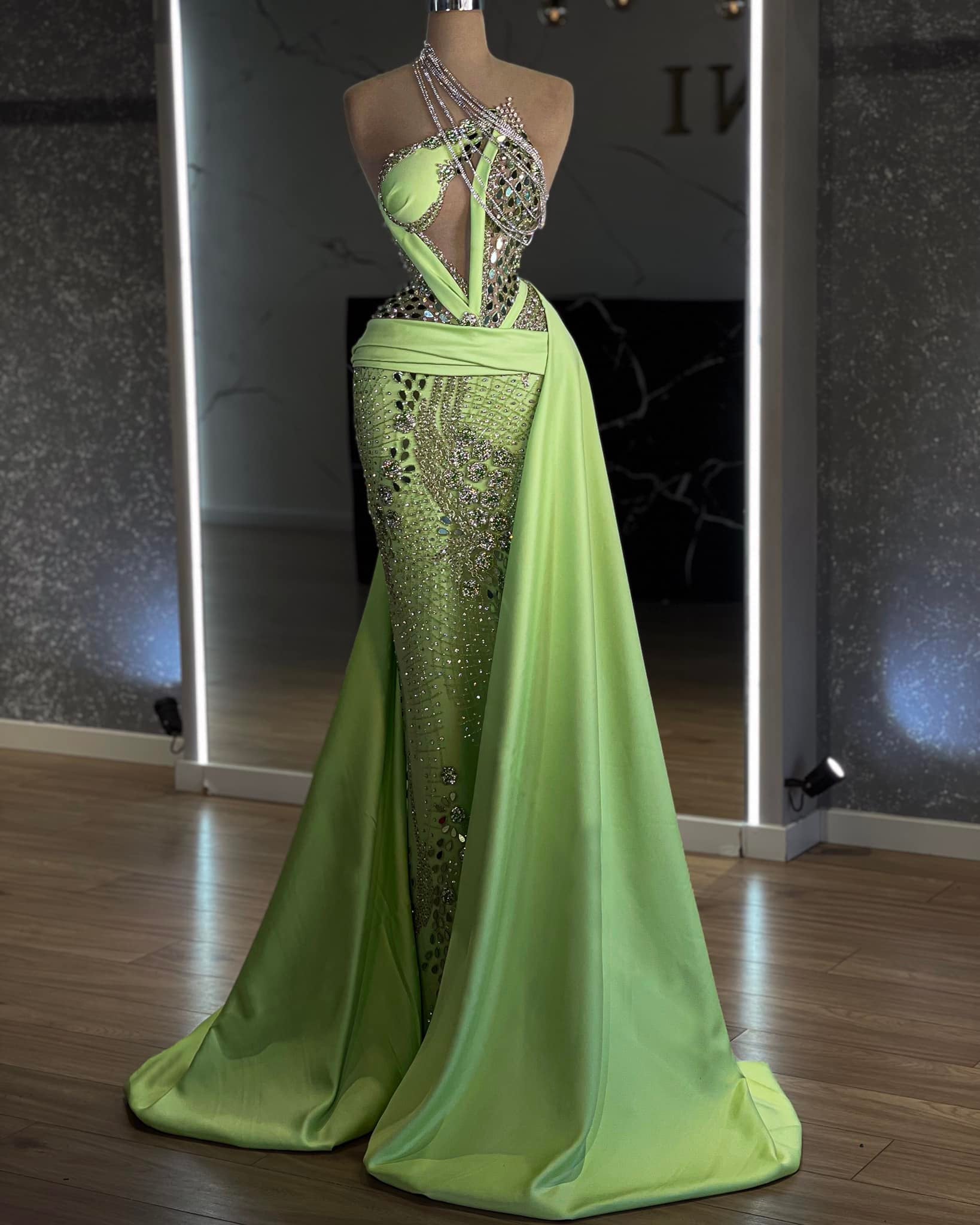 This long sleeveless dress is a true statement piece that is sure to make an impression. The light green color of the dress is a fresh and unique choice that will make you stand out in a crowd. The dress is adorned with a combination of stones, crystals, chains and mirrors, which catch the light beautifully and add a touch of sparkle and glamour to the dress. The chains and mirrors are used as alternative embellishments adding a modern and edgy touch to the dress. The dress is cut in a flattering silhouette that will flatter any figure and the long length of the dress creates a classic and timeless look. The dress is also made with high-quality fabric that feels soft and comfortable to wear, ensuring that you look and feel your best all night long. The combination of the light green color, the intricate embellishments, and the perfect cut, makes this dress a perfect choice for any formal event or evening out.