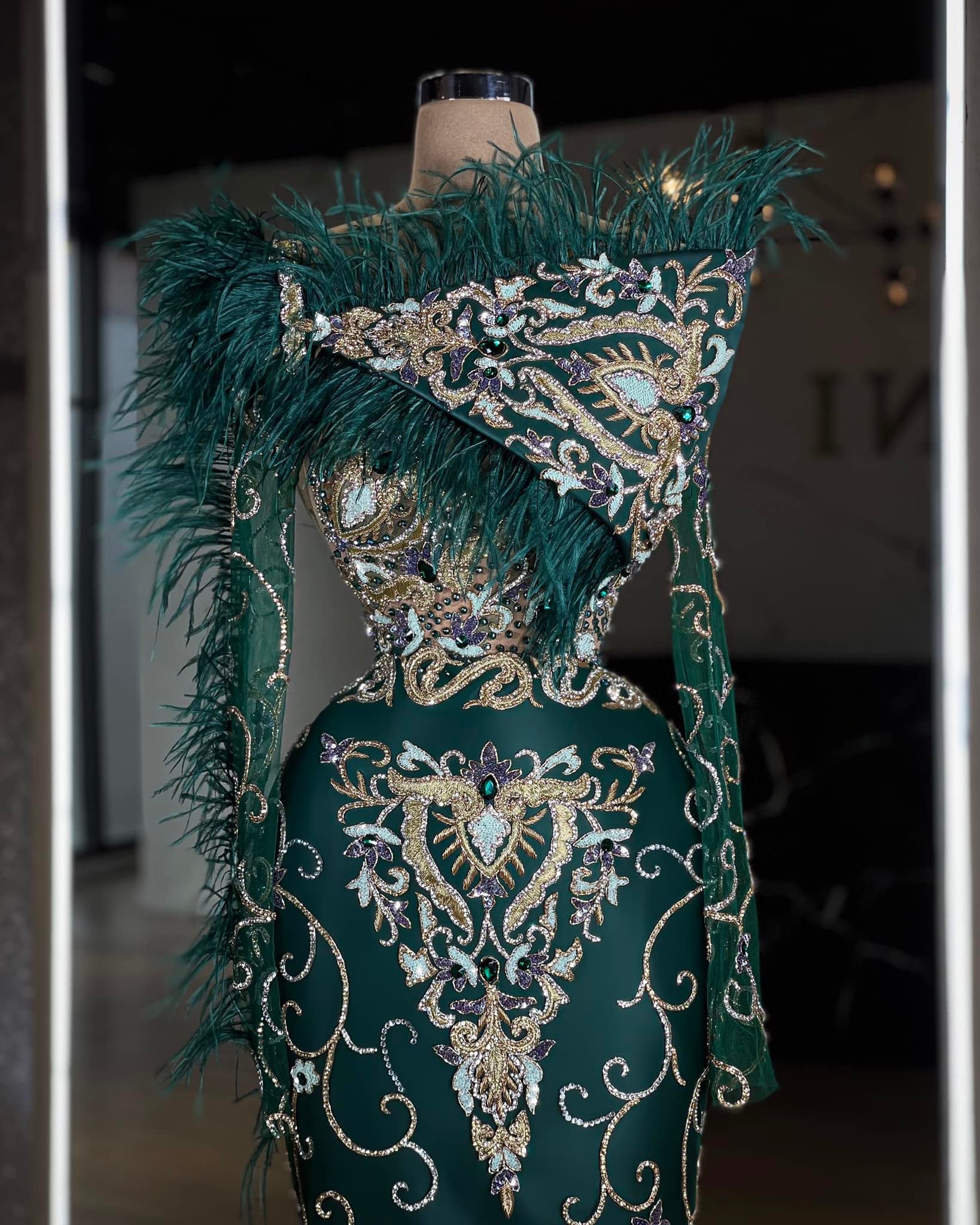 This long dress is a true work of art that is sure to make a statement. The green color of the dress is a fresh and unique choice that will make you stand out in a crowd. The dress is adorned with a combination of stones and feathers, which catch the light beautifully and add a touch of sparkle and glamour to the dress. The stones are used as embellishments adding a touch of shine and elegance to the dress. The feathers are used as an alternative embellishment adding a touch of delicacy and femininity to the dress. The dress is designed with long sleeves, which adds a touch of drama and elegance to the dress. The long sleeves are perfect to add a flowy and light movement to the dress and to create a modern and edgy look. The dress is cut in a flattering silhouette that will flatter any figure and the long length of the dress creates a classic and timeless look. The dress is also made with high-quality fabric that feels soft and comfortable to wear, ensuring that you look and feel your best all night long. The combination of the green color, the intricate embellishments, and the perfect cut, makes this dress a perfect choice for any special event or evening out.