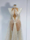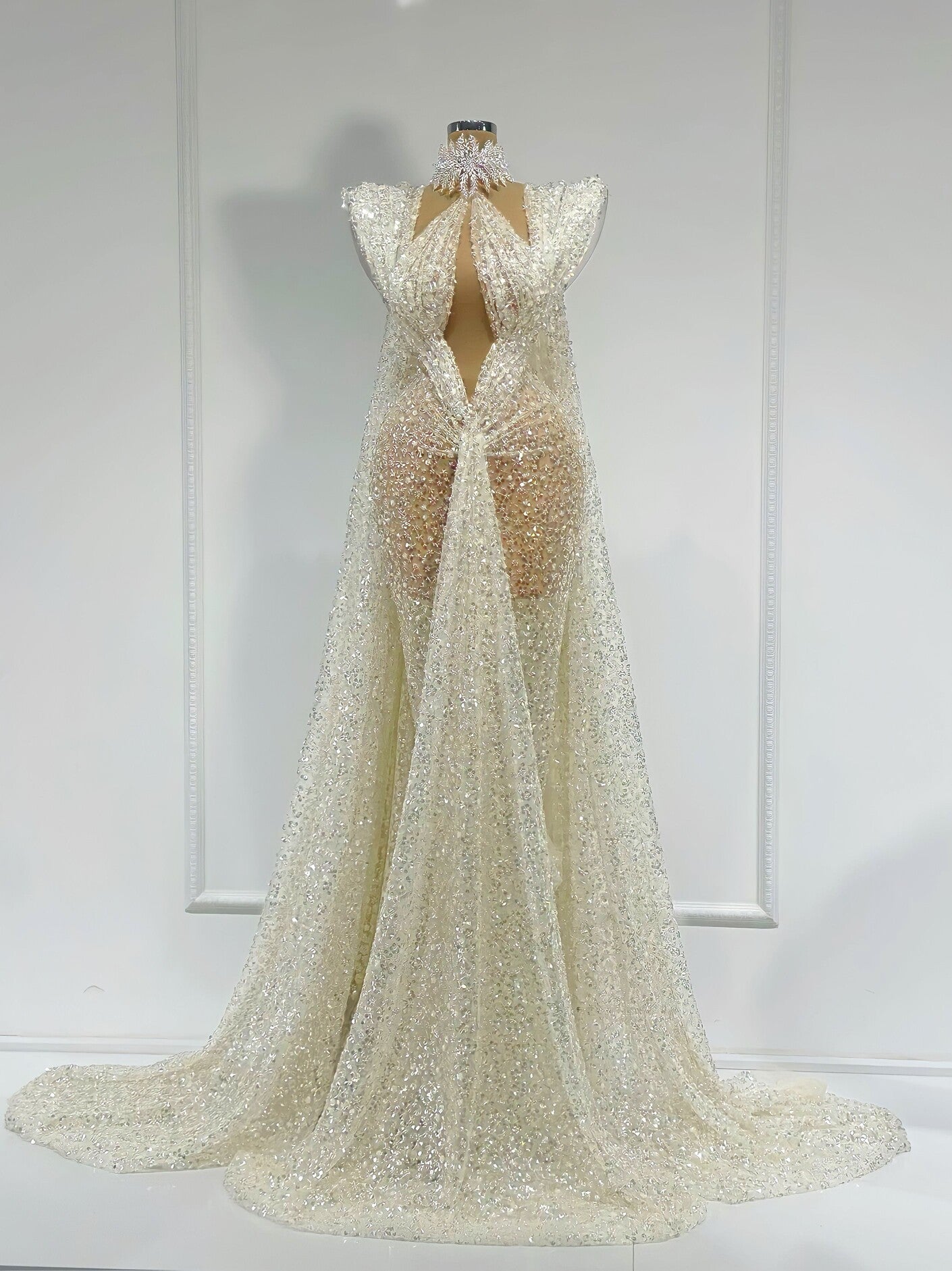 Introducing the epitome of glamour and elegance, a white sequin lace dress that is sure to turn heads and leave a lasting impression. This long, sleeveless dress features a high neckline, creating a demure yet striking silhouette. The neckline is assymetrical, with a deep cut in the chest, giving the dress a unique and captivating look. But the true showstopper of this dress is its majestic back cape, crafted from the same shimmering white sequins lace as the rest of the dress. The cape adds a dramatic and regal touch, perfect for making a statement at your next special occasion. Whether you're attending a wedding, a gala, or a red carpet event, this dress is sure to make you feel confident, beautiful, and absolutely unforgettable. So why wait? Slip into this stunning white sequin lace dress and let the world know you're ready for the spotlight!