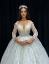 This stunning bridal dress is the epitome of glamour and elegance, featuring long cape sleeves and a daring open chest with a V neckline. The fitted bodice and flowing skirt create a feminine silhouette, while the sparkling sequins and crystals add a touch of sparkle and shine. The delicate lace detailing and sequin-encrusted design make this gown a perfect choice for any bride looking to make a statement on her special day. Whether you're planning a traditional church ceremony or a more modern outdoor celebration, this sequin-encrusted bridal dress is sure to turn heads and make you shine on your big day.