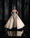 What sets this design apart is the detachable overskirt in a soft champagne hue, creating a striking contrast against the glittering silver base. This voluminous, flowing addition drapes elegantly from the waist, giving the dress a grand, ethereal presence as it moves. Delicate beading and scattered crystals further enhance the skirt, catching the light with every step.