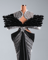 This black couture gown is the embodiment of drama, power, and refinement, designed for those who want to make an unforgettable entrance. Crafted in deep black with shimmering silver embellishments, it merges bold structure with fluid elegance.