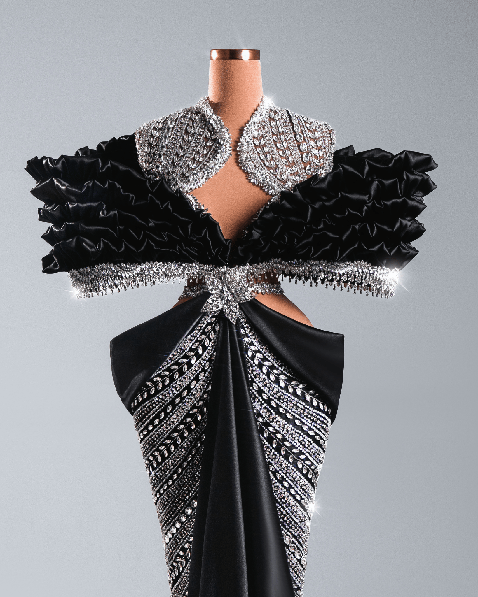 This design plays with contrast—soft draping meets sharp structure, darkness meets brilliance—resulting in a piece that is both regal and modern. Perfect for a gala, red carpet, or high-fashion editorial, this gown redefines black evening wear with a daring architectural twist.
