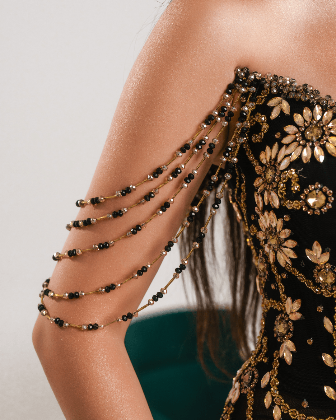 Crafted from a rich, jet-black fabric that flows seamlessly over the body, the gown is adorned with gold crystal embellishments that glimmer like stardust. These intricate accents are artfully arranged to highlight the curves, adding dimension and luxury to the overall look. The contrast between the deep black and the opulent gold crystals evokes a regal aesthetic, perfect for making a powerful statement.