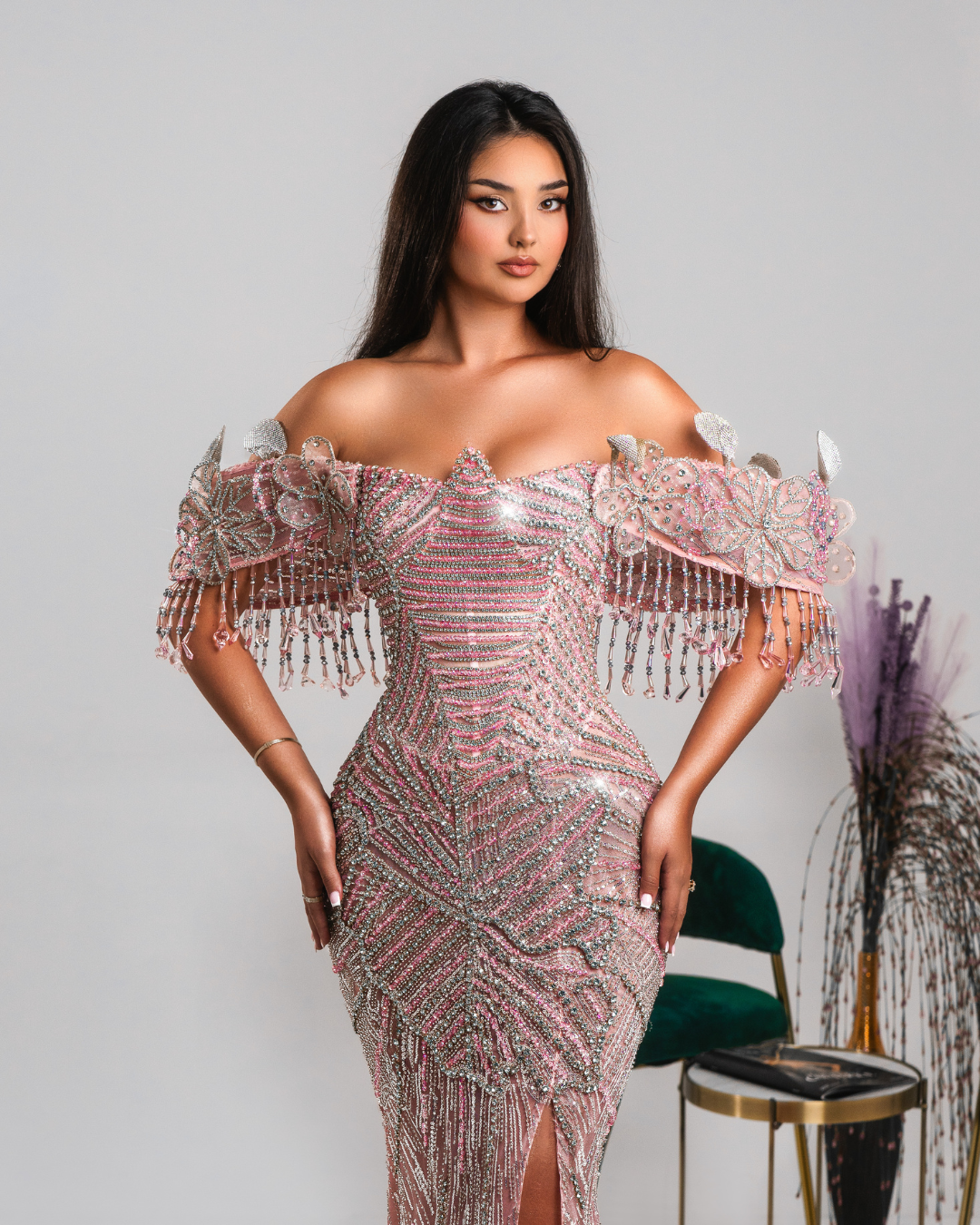 This exquisite long pink gown is the embodiment of romantic elegance and modern glamour. Crafted in a soft blush hue, the design features an enchanting off-shoulder neckline, effortlessly showcasing the collarbones and adding a delicate, feminine charm. The fitted bodice is adorned with crystal embellishments and handcrafted floral appliqués, creating a dreamy interplay of sparkle and texture.