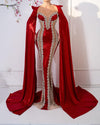The dress is beautifully adorned with delicate crystal details, strategically placed to catch the light and add a subtle sparkle. The crystals elevate the design, bringing an air of glamour and refinement. These shimmering accents create a striking contrast against the deep red fabric, enhancing the dress’s overall opulence.