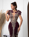 Step out in style with this luxurious long dress, crafted from rich ruby velvet lace. Its deep V neckline adds a touch of allure to its elegant silhouette, while its deep slit provides a hint of sexiness. The entire dress is further embellished with an array of sparkling stones and crystals, creating a radiant and eye-catching effect. This dress is perfect for any formal occasion, where you want to make a lasting impression and turn heads. The velvet lace fabric provides a rich and sumptuous feel, while its stunning ruby hue will add a pop of color to your look. Whether you're attending a wedding, a gala, or any other special event, this deep V neckline, crystal-encrusted dress is sure to have you feeling like a true fashion icon.