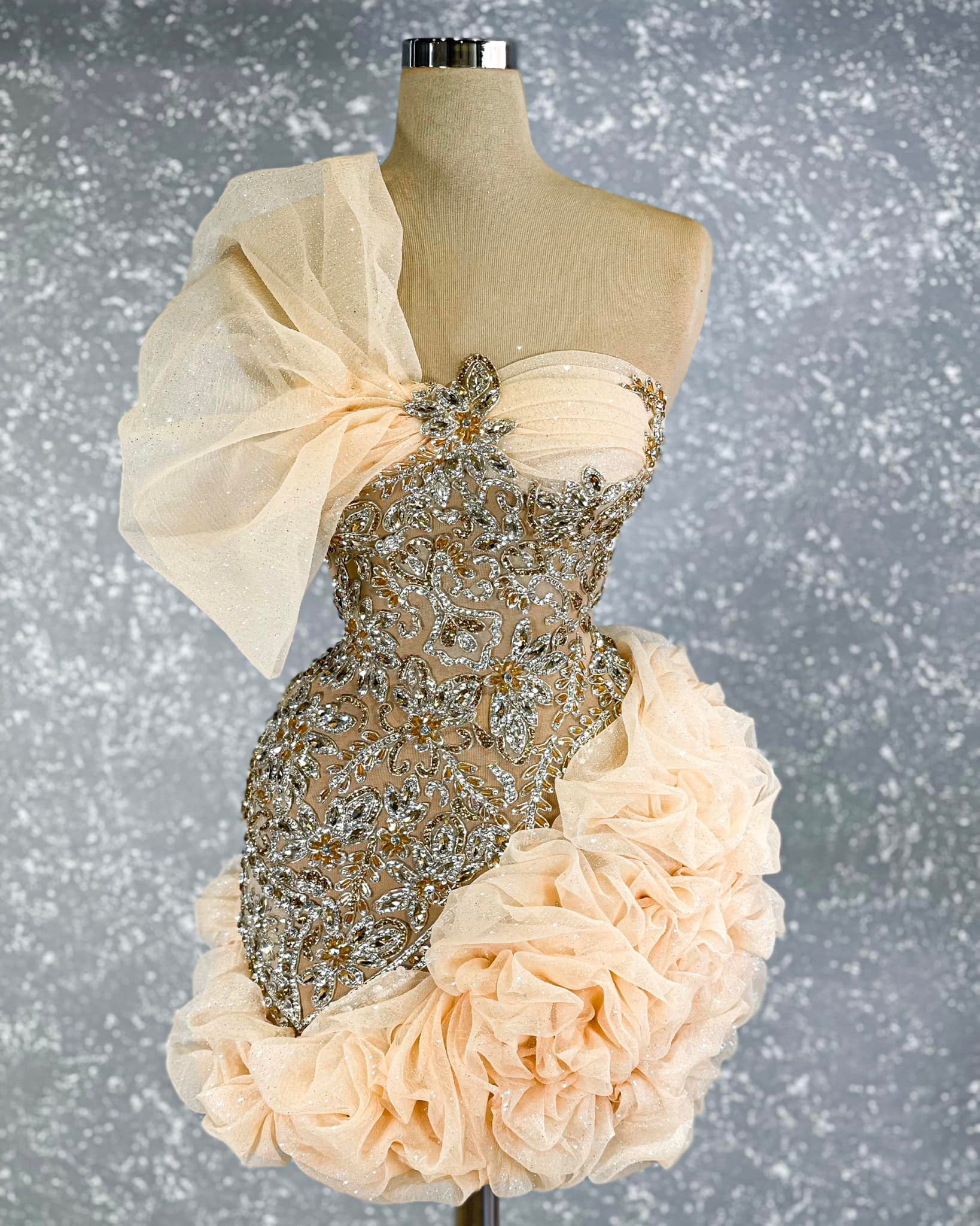 This short dress is a true masterpiece, featuring a beautiful peach color that is both feminine and elegant. The dress is sleeveless, making it perfect for warmer weather and allowing you to show off your arms. The dress is embellished with sparkling stones that add a touch of glamour and luxury to the overall look. The dress is designed with layers of peach colored tulle that flow gracefully as you move, creating a mesmerizing effect. The tulle layers also add a playful and feminine flair to the dress.