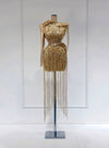 This stunning gold short dress is a showstopper that's sure to turn heads. The one-shoulder design adds a touch of sophistication and glamour, while the intricate embellishments of mixed colored stones and crystals bring a dazzling and eye-catching sparkle to the dress. The luxurious tassels complete the look, adding a playful and flirty touch to this already stunning dress. The stones and crystals are carefully placed to create a shimmering effect, capturing the light beautifully and making this dress the perfect choice for a special occasion. The luxurious fabric drapes beautifully, creating a flattering silhouette and highlighting your curves in all the right places. Whether you’re attending a cocktail party, a night out on the town, or simply looking for a dress that will make you shine, this gold short dress with one-shoulder design and stone and crystal embellishments is sure to deliver. So why wait? Embrace the glamour and add this stunning gold short dress to your wardrobe today!