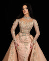 This Peach Dress is not just a garment; it is a work of art that harmonizes sophistication, luxury, and a touch of fairytale charm. Furthermore, this dress promises to be a stunning addition to any special occasion. It will make you the epitome of grace and style, whether you choose to wear it with or without the detachable overskirt.