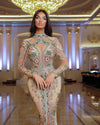 This long dress is adorned with intricate beadwork, making it a true statement piece for any special occasion. The bead embellishments add sparkle and glamour to the elegant silhouette of the dress, making it perfect for formal events or red carpet appearances. The dress is made of a soft and flowing fabric, making it comfortable to wear and perfect for dancing the night away. The beadwork covers the entire dress, adding a touch of shimmer to every inch of the garment. Pair with simple heels and minimal jewelry to let the dress shine. This beaded long dress is sure to make you feel like the belle of the ball.