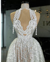 A sleeveless, highneck wedding dress is a beautiful and elegant choice for any bride. The highneck design of this gown elongates the neck and adds a touch of sophistication, while the sleeveless design keeps the look light and airy. The dress is made of a soft and luxurious fabric that drapes beautifully, creating a flattering silhouette that is perfect for any body type. The clean lines and simple design of this gown make it a versatile choice that can be dressed up or down with the right accessories. Whether you choose to add a veil, a statement necklace, or a pair of sparkling earrings, this sleeveless, highneck wedding dress is sure to make you feel like a princess on your big day. Whether you're having a traditional or a more modern wedding, this gown is a timeless and classic choice that will never go out of style.
