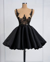 This breathtaking short ball gown is a true work of art. The dress is made from luxurious black satin fabric, which drapes beautifully and adds a touch of elegance to the overall design. The dress features a fitted bodice that hugs the curves of the body and creates a flattering silhouette.