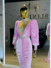 This beautiful light pink long velvet dress is the perfect choice for any woman looking to add a touch of romance and femininity to her style. The soft, pastel pink color is delicate and romantic, and the velvet fabric adds a touch of luxury and sophistication. The dress is embellished with flashy crystals that add a touch of glamour and sparkle, making it perfect for any special occasion. The long puff sleeves and figure-hugging silhouette create a feminine and flattering look that will have you feeling confident and fashionable. The rich, luxurious fabric drapes beautifully over the body, creating a sleek and sophisticated silhouette. Whether you're attending a formal event or simply want to add a touch of romance to your everyday look, this light pink velvet dress is sure to turn heads wherever you go. The combination of the rich fabric, soft color, and sparkling accents make this dress a true showstopper.