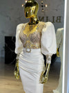 This long satin white dress is a truly stunning piece that is perfect for any special occasion. The dress features puff sleeves adorned with sparkling stones that add a touch of glamour and sparkle. The deep slit in the front adds a touch of sexiness to the overall look. The satin material is smooth and silky to the touch, making it comfortable to wear all day or night. The white color is classic and elegant, making this dress a timeless choice. Whether you're attending a wedding, prom, or any other formal event, this dress is sure to make you feel confident and stylish.