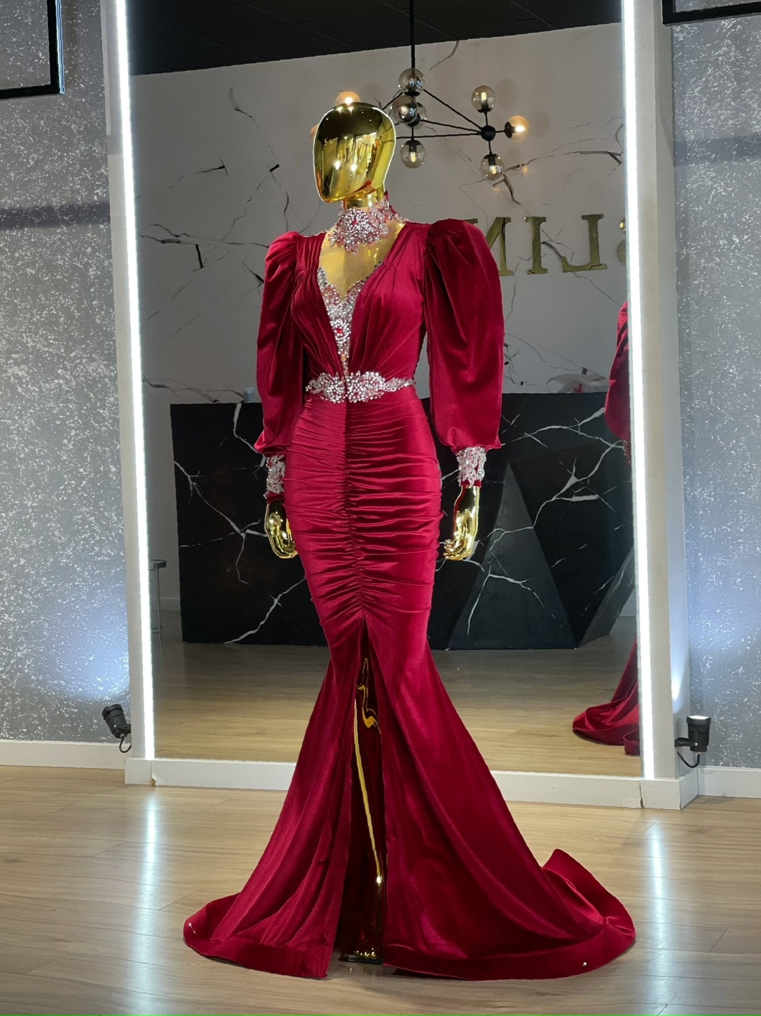 This long velvet dress is a true showstopper that is sure to turn heads wherever you go. The bold, fiery shade of red adds a touch of passion and drama to the dress, while the sparkling stones bring a touch of sparkle and shine. The long puff sleeves add a playful and feminine touch to the overall look, while the long length of the dress ensures a sleek and elegant silhouette. The high quality craftsmanship of the dress is evident in every detail, from the expertly placed stones to the carefully tailored sleeves. Whether you're attending a formal event or a night out on the town, this velvet and stone dress is sure to make a lasting impression. Either way, this velvet and stone dress is a versatile and eye-catching addition to any wardrobe.