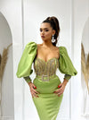 This delightful maxi-length dress is a beautiful pistachio green color that will bring a fresh and playful vibe to your wardrobe. The puff sleeves add a fun and feminine touch, while the flowing silhouette and lightweight fabric make it a comfortable and easy-to-wear option. Whether you're dressing up for a special occasion or just want to add some color to your everyday style, this pistachio green maxi dress with puff sleeves is a perfect choice. Pair it with some neutral heels and minimal jewelry for a chic and polished look.