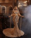 This breathtaking gown is the embodiment of royal elegance and modern opulence. Crafted with meticulous attention to detail, the dress features a figure-hugging silhouette that cascades into a dramatic, embellished train, exuding pure sophistication. The base is made from a nude illusion fabric, fully adorned with hand-sewn crystals, sequins, and intricate beadwork that shimmer with every movement.
