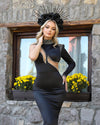 This high neck long black dress is a true statement piece. The deep cuts in the chest and waist add a touch of sexiness to the elegant silhouette, while the single sleeve adds a unique and fashion-forward twist. The dress is made of a luxurious and comfortable fabric that drapes beautifully and flatters the figure. The high neckline elongates the torso and creates a graceful, elongated silhouette, while the cutout details draw the eye and add a touch of glamour. Whether you're attending a formal event or a special occasion, this dress is sure to make an impression.